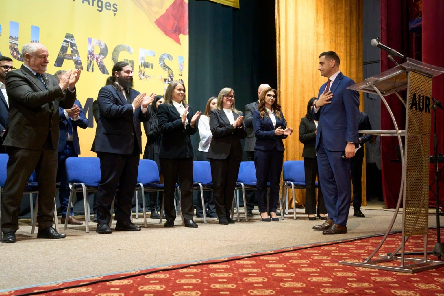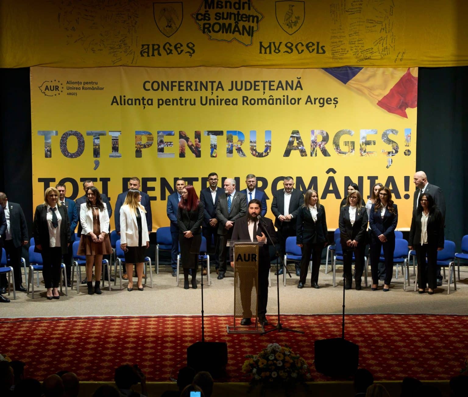 Ei sunt oamenii de AUR, voi sunteți oamenii de AUR. Și de aici, din Argeș, din județul Brătienilor și a martirilor de la Nămăești, din județul Nucșoarei Elisabetei Rizea, din județul regiilor noștri de la Curtea de Argeș, din județul celor care n-au uitat niciodată să spună Doamne ajută-ne, le transmitem tuturor un mesaj și sunt convins că se uită foarte mulți români.